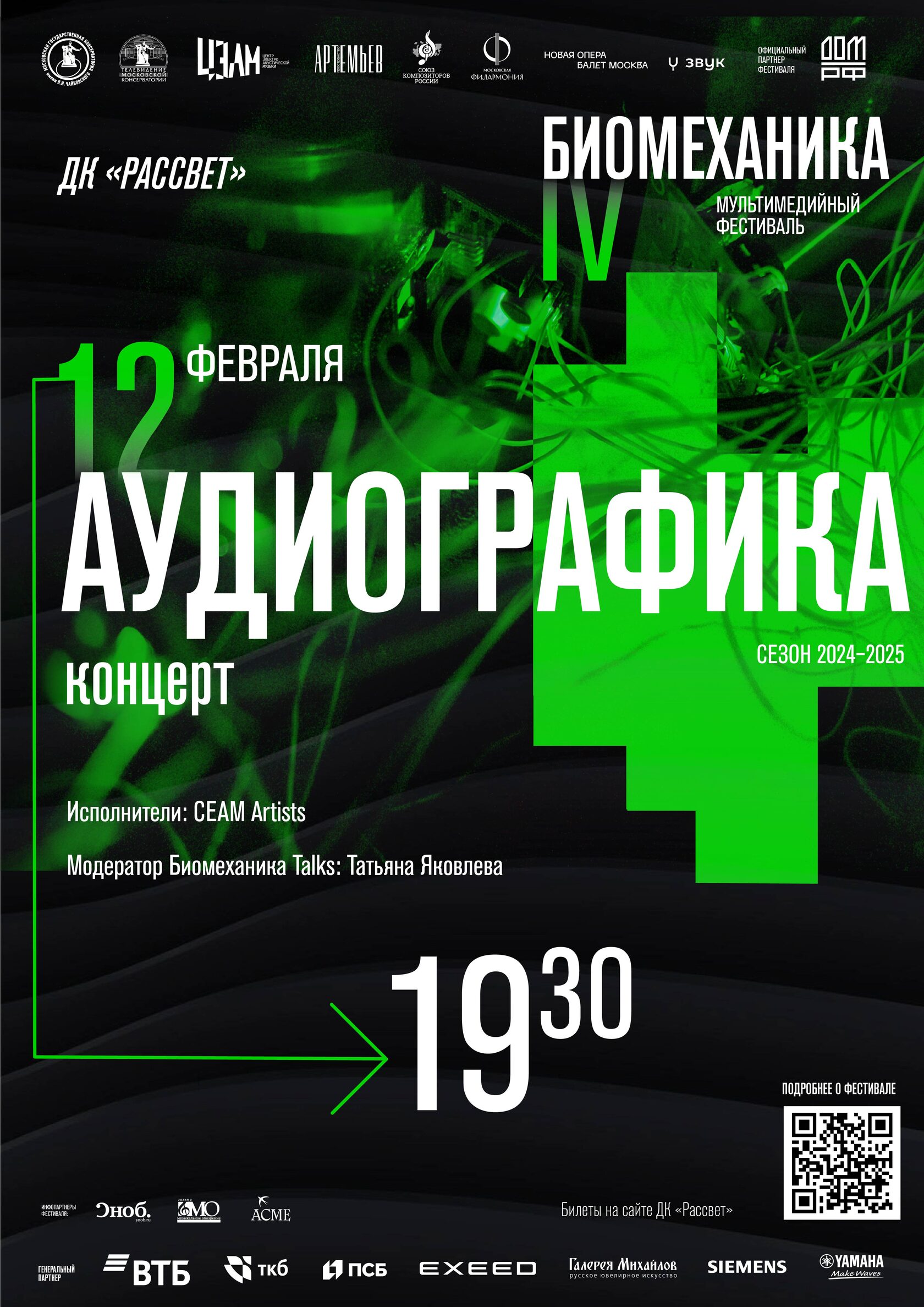 Музыка часто воспринимается как исключительно аудиальное искусство, но это не вполне так. Различные способы визуализации звука возникали еще в древних культурах, а в европейской традиции связаны с активным развитием системы записи нот. Графические отображения — неотъемлемый элемент компьютерного ПО или работы электронных инструментов. На концерте «Биомеханики» можно будет проследить взаимосвязи между звуком, его визуальными составляющими, светом и видео. Пьеса Пьера Жодловски представляет собой настоящий театральный перформанс с прописанной автором сценографией, в произведении Симона Лёфлера будет задействоваться светомузыкальный инструмент, а у Игоря С Силвы ключевую роль сыграют световые проекции. Здесь можно будет обнаружить и пересечения с эстетикой мультимедиа-арта или массовой музыкой, как например, отсылки к гиперпопу у Алекса Пэкстона.