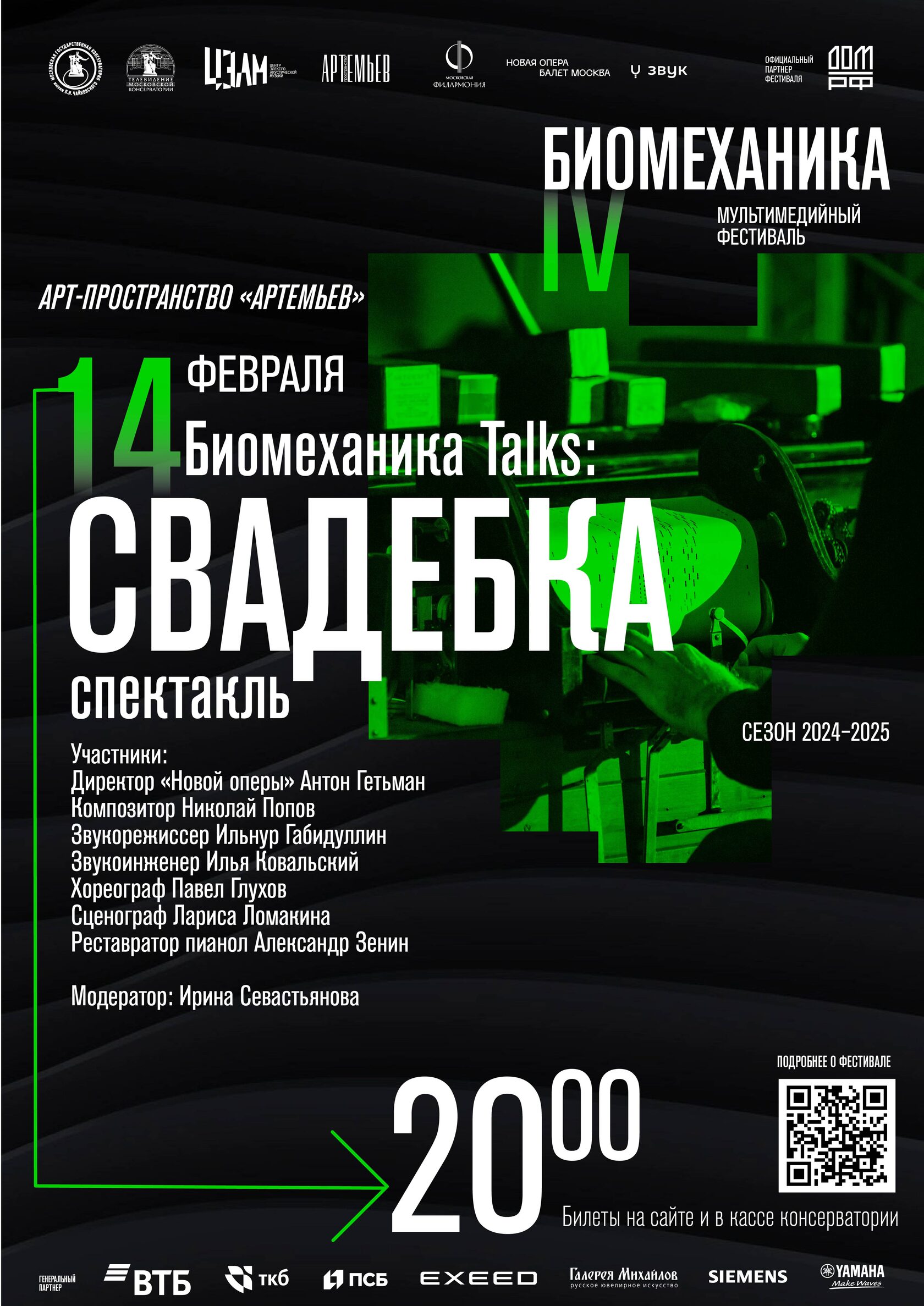 На фестивале «Биомеханика» пройдет серия показов спектакля «Свадебка» — совместного проекта композитора Николая Попова, ЦЭАМ, театров «Новая опера» и «Балет Москва». О его создании речь пойдет на Биомеханика Talks в арт-пространстве «Артемьев». Команда ЦЭАМ расскажет, как идеи Стравинского соединились с современными технологиями, о звуковых решениях в спектакле и объединении партитуры столетней давности с новой музыкой, а сценограф Лариса Ломакина и хореограф Павел Глухов — о драматургическом и визуальном воплощении своих идей. Специальной гость паблик-тока — директор «Новой оперы» Антон Гетьман.
