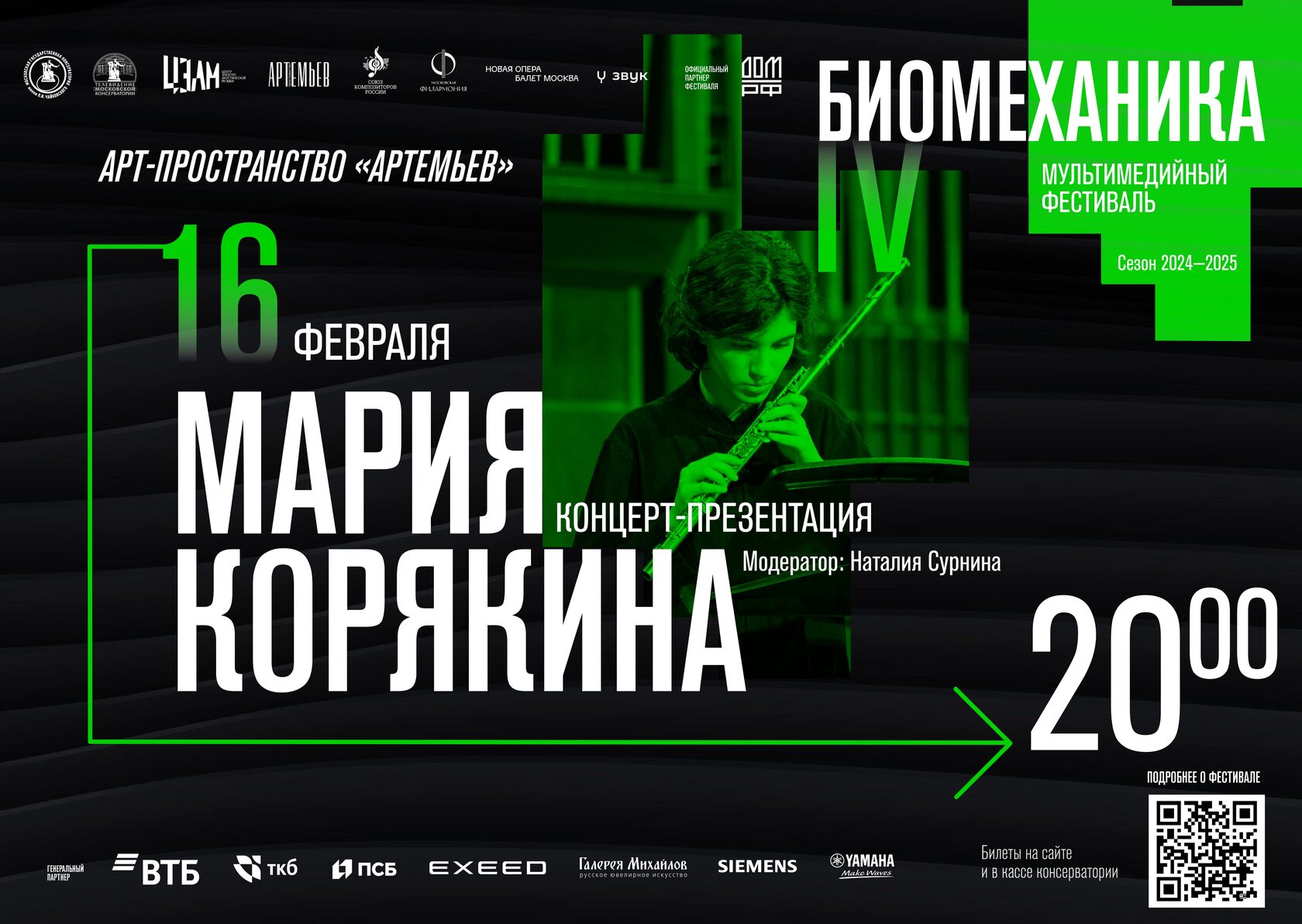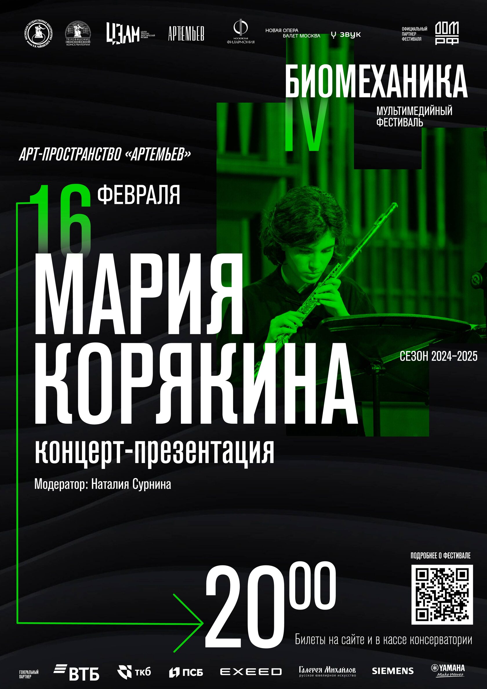 Героиней финального концерта-презентации на «Биомеханике» станет флейтистка CEAM Artists Мария Корякина. В пьесах она будет использовать разные виды флейт. Произведения программы никогда раньше не исполнялись в России, а сочинение Олега Гудачёва создается специально к фестивалю. После концерта музыковед Наталия Сурнина проведет паблик-ток с Марией, где посетители арт-пространства «Артемьев» тоже смогут задать вопросы исполнительнице.